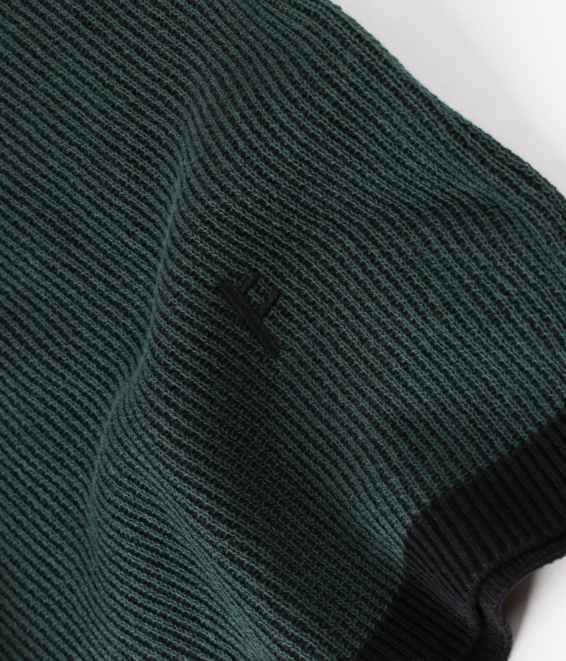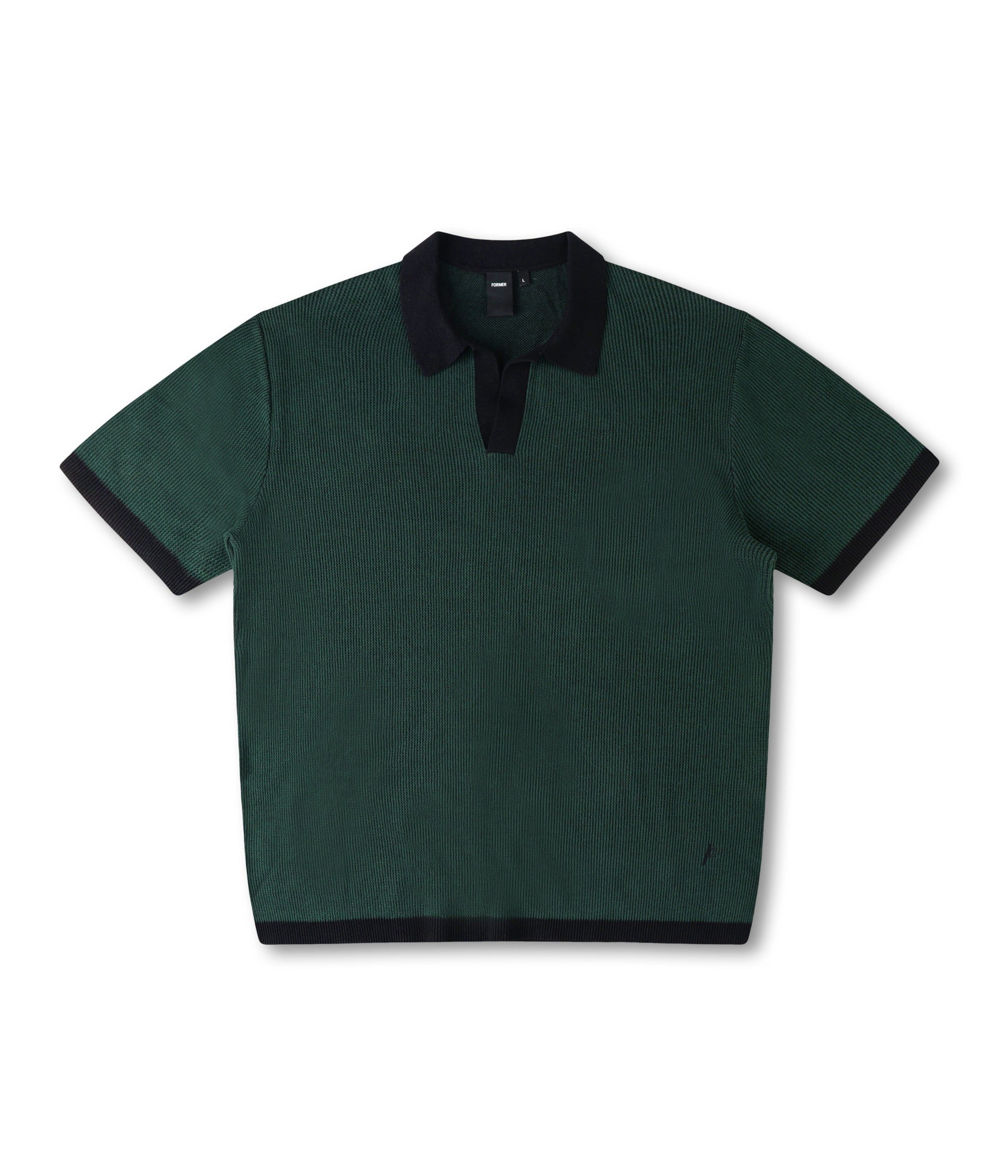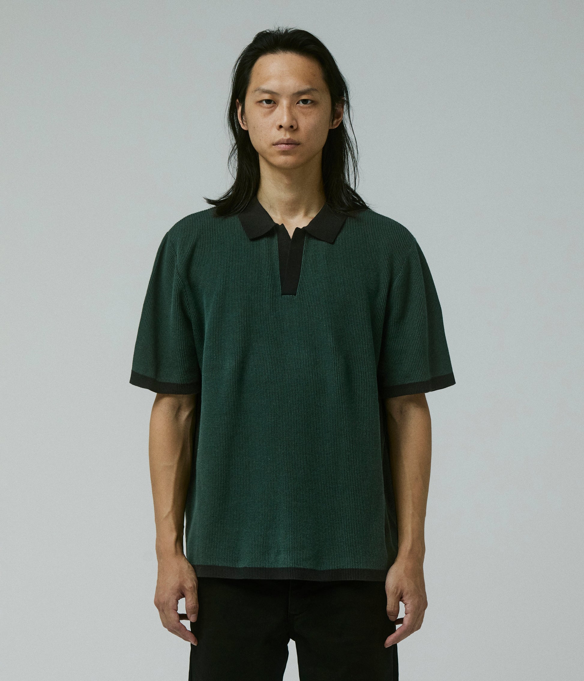 Crafted in a premium 100% cotton 12 gauge knit and designed in collaboration with FORMER founder Austyn Gillette. Delivered in our FORMER open collar polo knit fit. Featuring embroidery on hip, two tone half cardigan stitch construction, and knitted rib hem and collar.