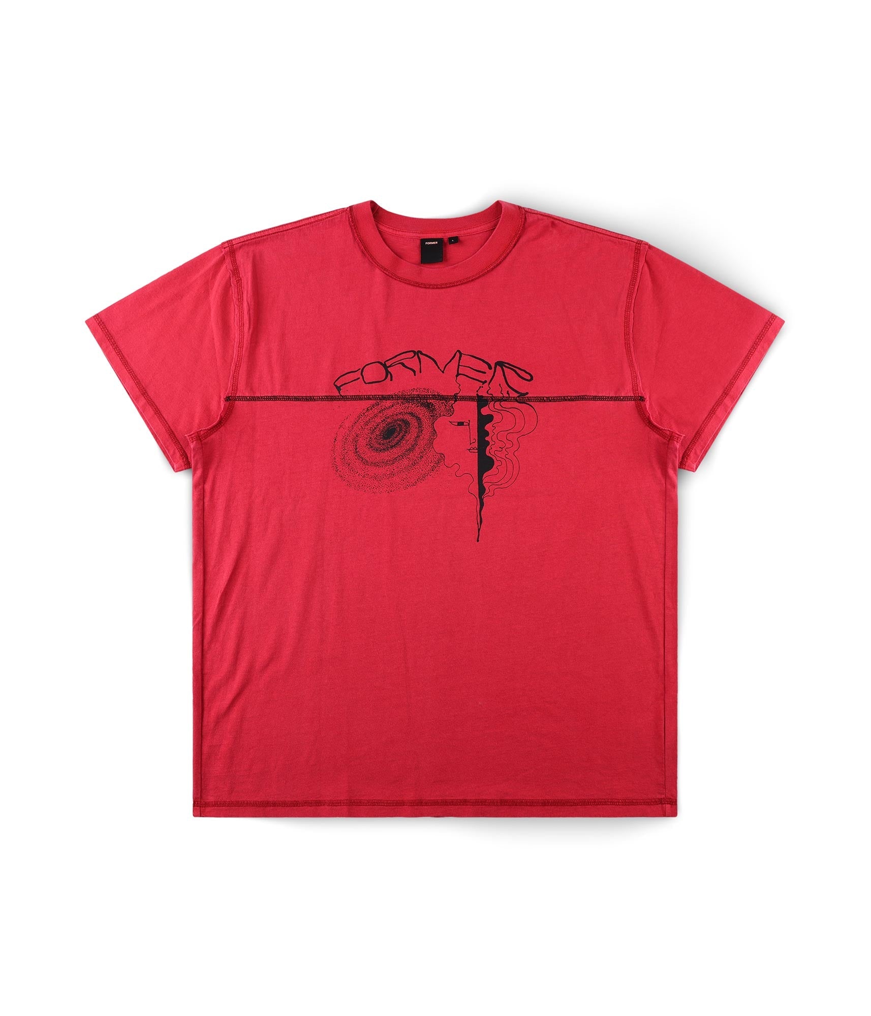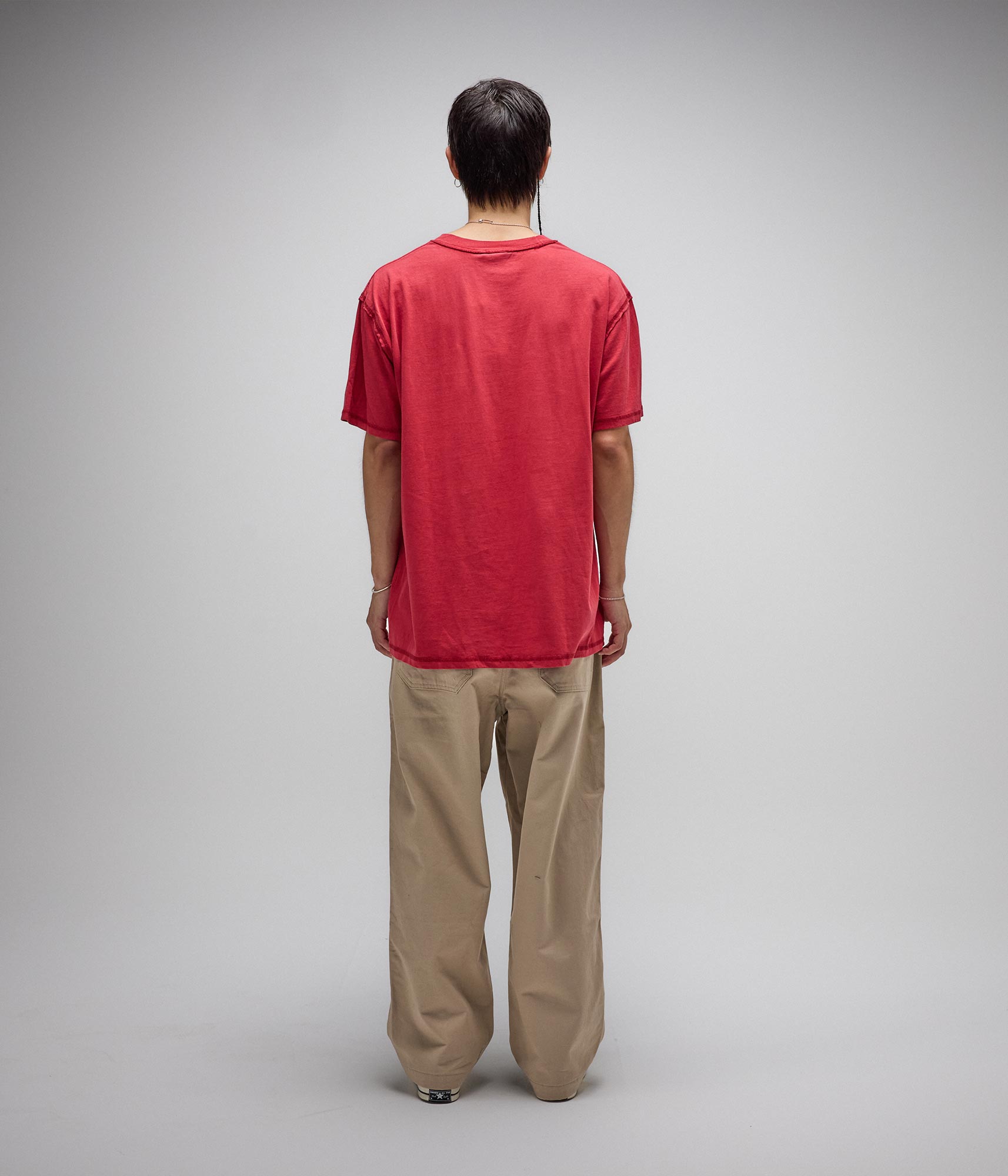 Designed in a premium 200GSM jersey cotton and delivered in our standard FORMER T-shirt block. Featuring an over-dyed finish, a cut and sew chest panel with cover stitch detail, and a front graphic in a soft hand plastisol screen print.