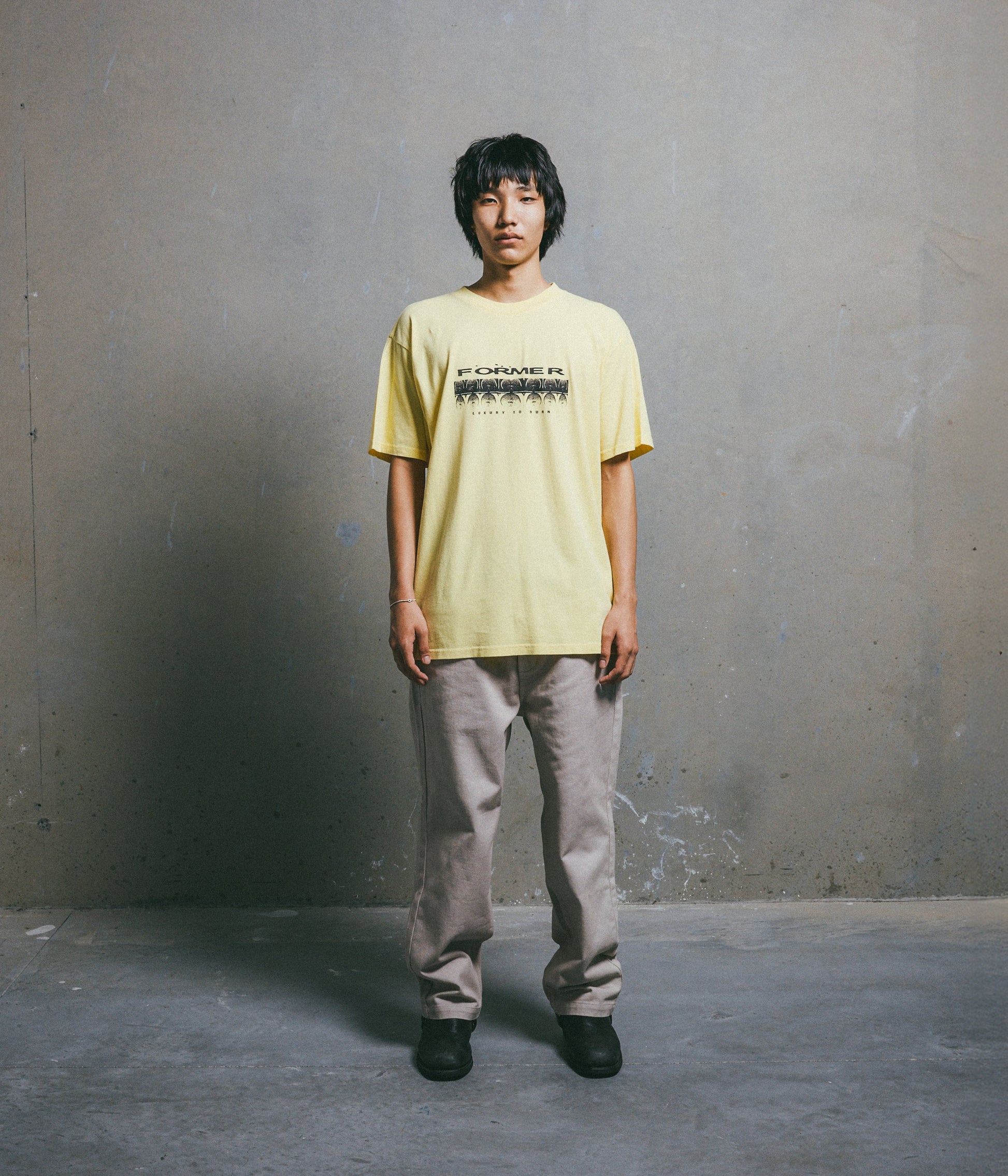 Designed in a premium 200GSM jersey cotton and delivered in our standard T-shirt block for a relaxed and comfortable fit. Featuring a seasonal front graphic in a soft hand plastisol screen print and delivered in our FORMER "Merch-Wash" for a vintage worn-in feel.