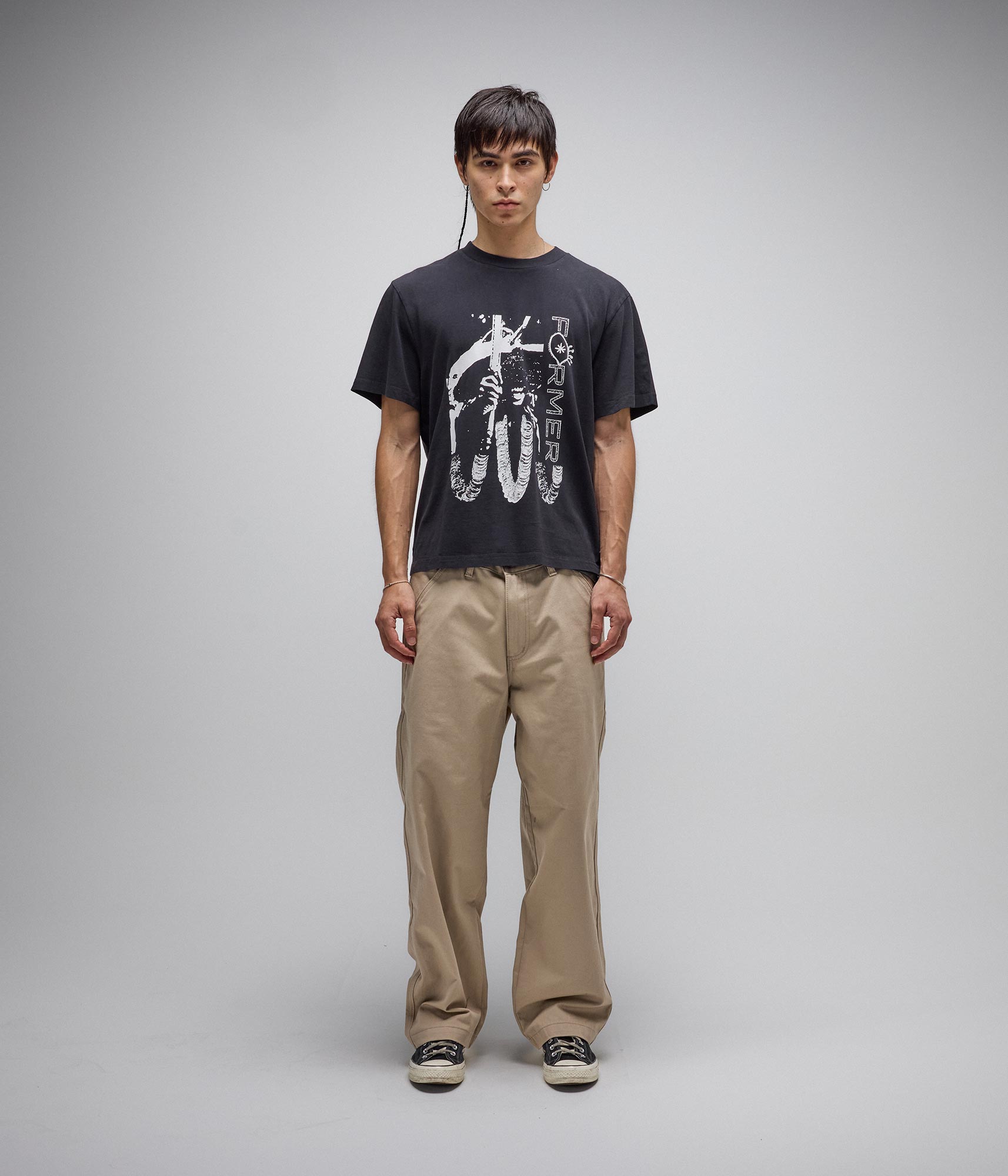 Designed in a premium 200GSM jersey cotton and delivered in our FORMER Shrunken T-shirt fit for a slightly cropped look. Featuring an overdyed finish and a seasonal front graphic in a soft hand plastisol screen print.