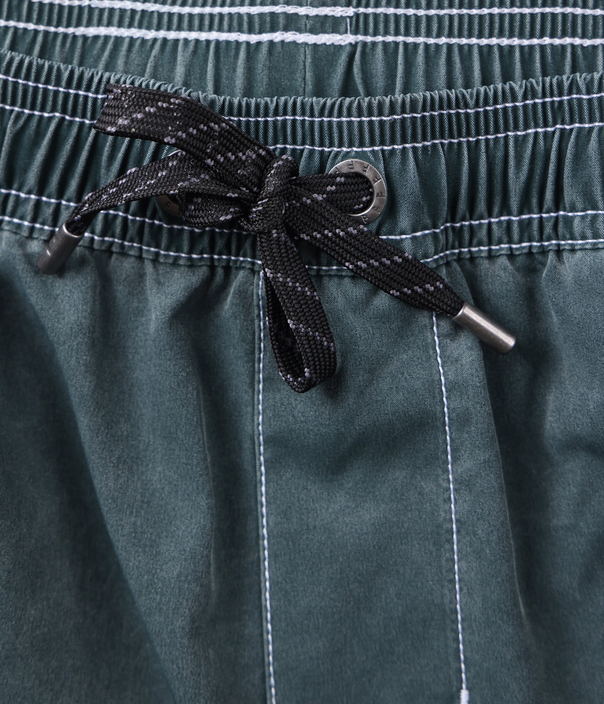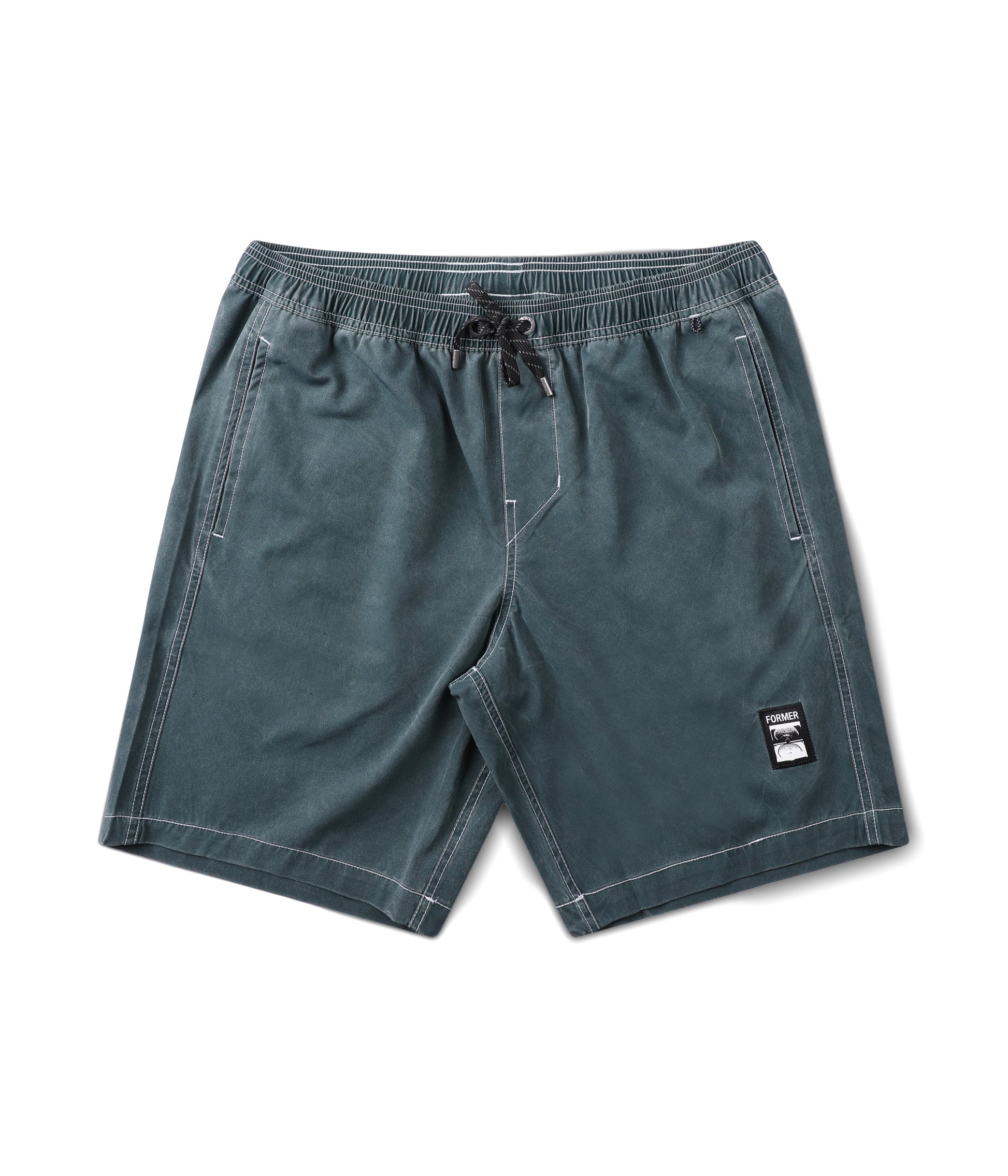 Constructed from a sustainable recycled polyester-spandex blend (90% recycled polyester 10% spandex) 4-way stretch fabric with a pigment print and vintage wash finish. Delivered in our FORMER Swans 18" swim trunk fit. Featuring signature velcro back patch pocket with FORMER webbing and eyelet, contrast stitch, drawcord closure with Franchise F metal aglets, elastic key loop, and elastic waist.