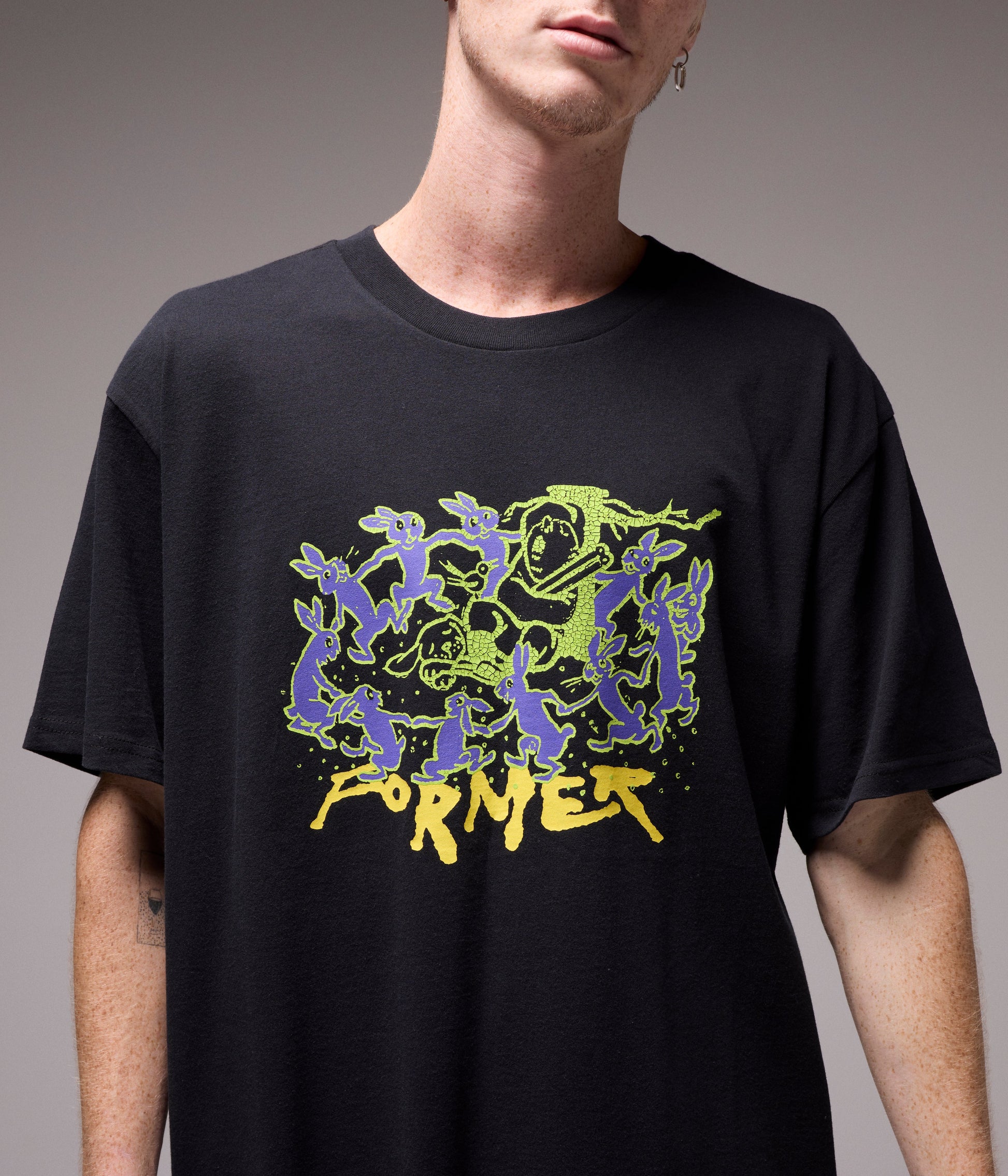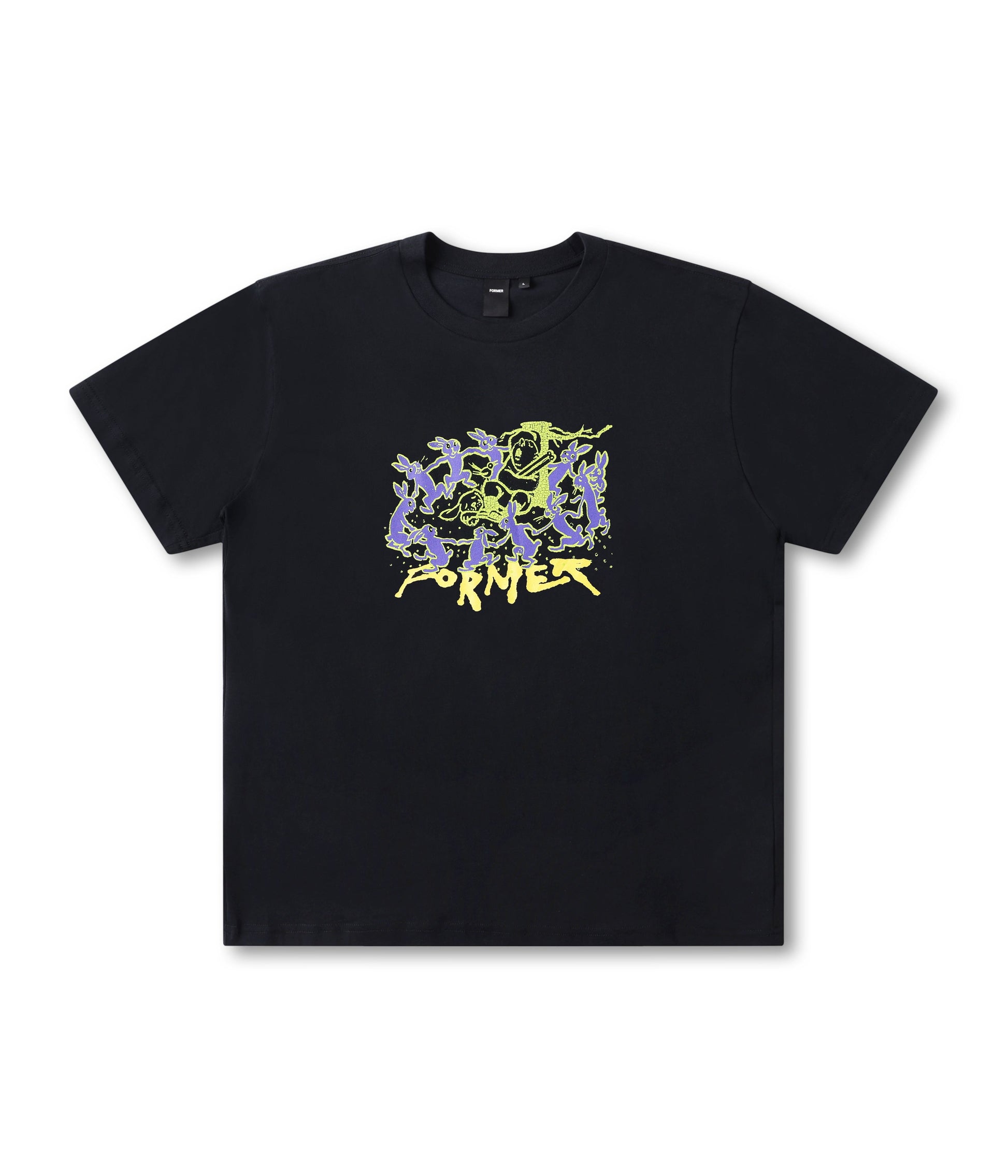 Designed in a premium 200GSM jersey cotton and delivered in our standard T-shirt block for a modern and comfortable fit. Featuring a seasonal front graphic in a soft hand plastisol and cracked print on a solid black base color.